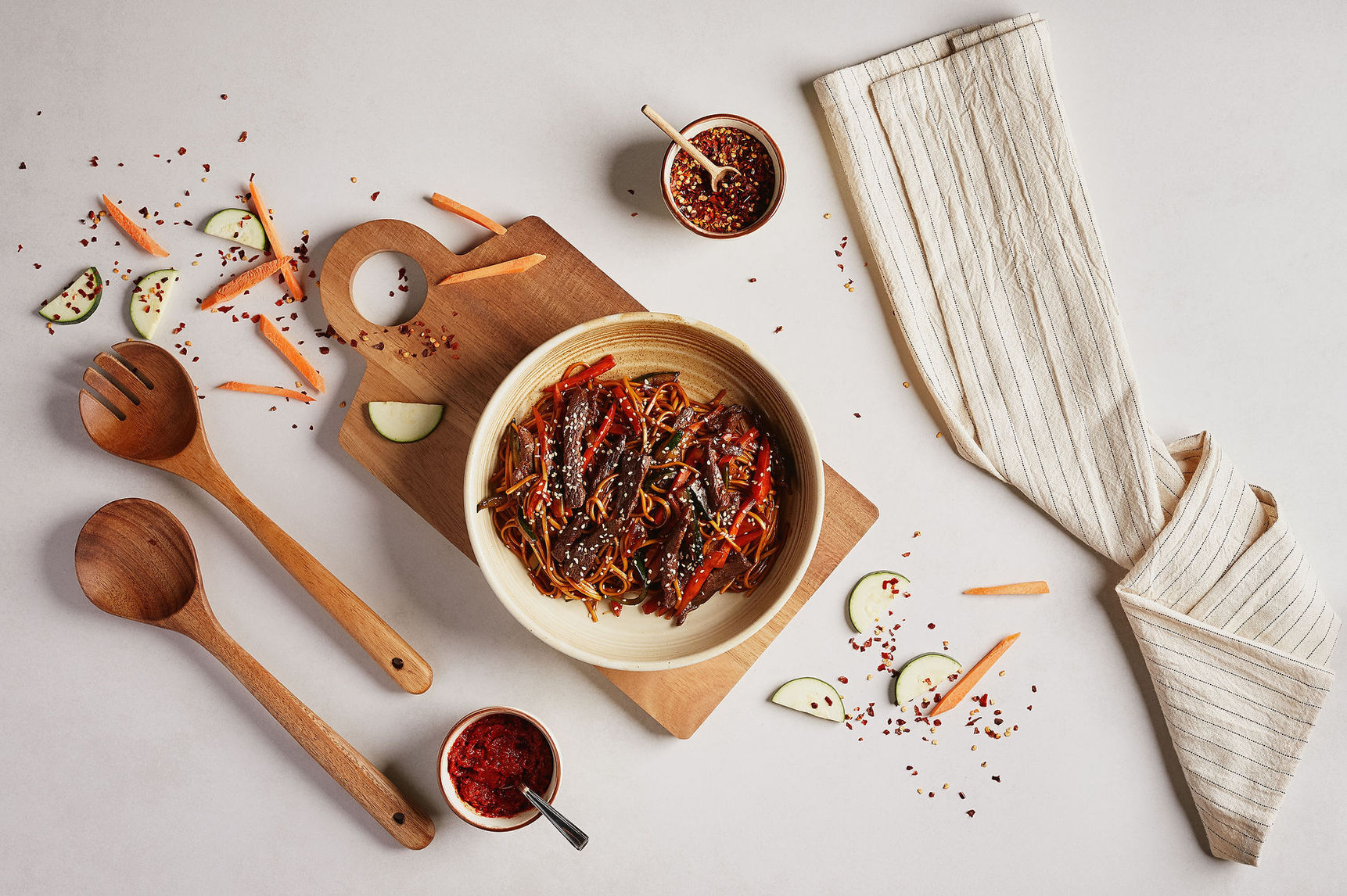 Noodles cu fâșii de vrăbioară de mânzat (sirloin) proaspăt, sotate alături de dovlecei și morcovi crocanți, glazurate într-un sos teriyaki ușor picant și ulei de susan | 400g | 69 lei