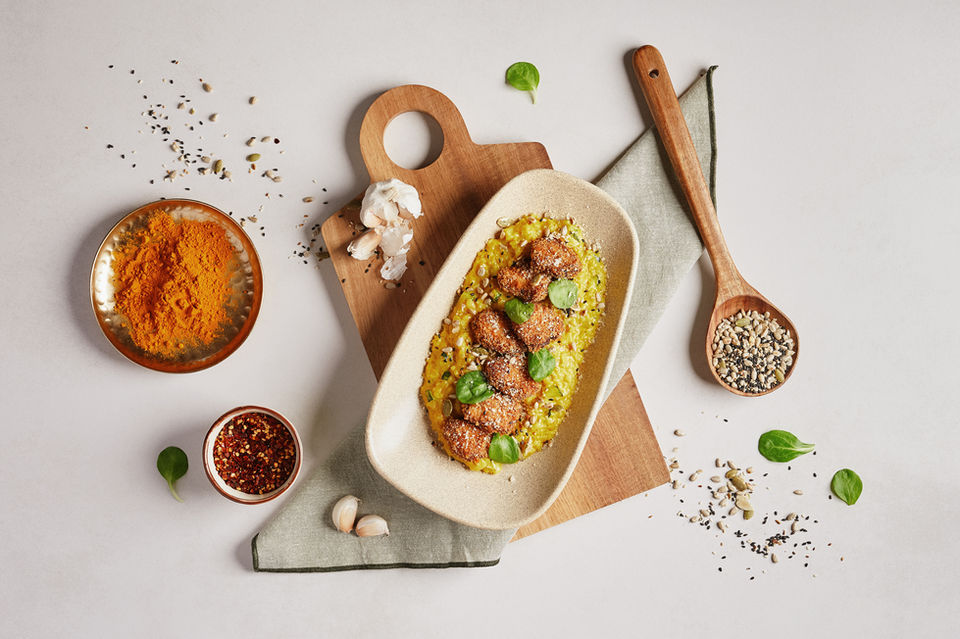 Piept de pui Masala, învelite într-o crustă crocantă de panko, alături de un orez cremos cu dovlecei, gătite în vin alb, parmezan și curcuma cu semințe prăjite | 380g | 62 lei